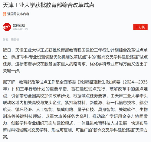 据了解,教育部改革试点工作是全面落实《教育强国建设规划纲要(2024—2035年)》和三年行动计划的重要举措,旨在通过试点先行,破解改革中的痛点难点,引领带动全国高校加快改革步伐。根据试点任务要求,由天津工业大学牵头联动区域内相关高校与龙头企业,紧扣新材料、新能源、新一代信息技术、航空航天、循环经济、人工智能、集成电路、量子科技、具身智能、关键软件、生物制造等关键科技领域,以重大攻关任务为牵引,推动政产学研用金多方协同发力,创新学科专业组织形态与建设模式,一体推进教育科技人才发展,快速布局新材料领域新兴交叉学科,形成可复制、可推广的“新兴交叉学科建设路径”天津方案。