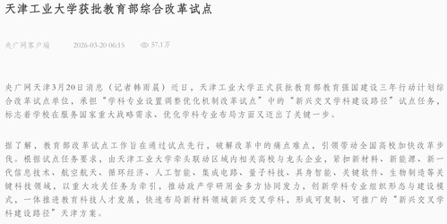 央广网天津3月20日消息(记者韩雨晨)近日,天津工业大学正式获批教育部教育强国建设三年行动计划综合改革试点单位,承担“学科专业设置调整优化机制改革试点”中的“新兴交叉学科建设路径”试点任务,标志着学校在服务国家重大战略需求、优化学科专业布局方面又迈出了关键一步。