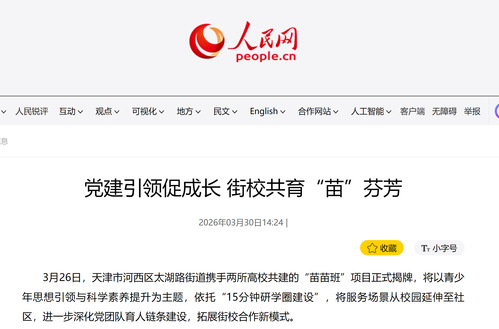 3月26日,天津市河西区太湖路街道携手两所高校共建的“苗苗班”项目正式揭牌,将以青少年思想引领与科学素养提升为主题,依托“15分钟研学圈建设”,将服务场景从校园延伸至社区,进一步深化党团队育人链条建设,拓展街校合作新模式。