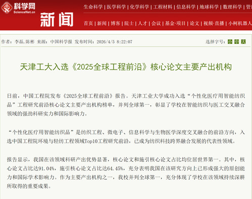 日前,中国工程院发布《2025全球工程前沿》报告。天津工业大学成功入选“个性化医疗用智能纺织品”工程研究前沿核心论文主要产出机构榜单,并列全球第一,彰显了学校在智能纺织与医工交叉融合领域的强劲科研实力和国际影响力。