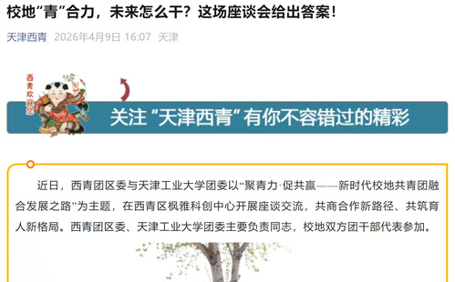 下一步,双方将以此次座谈为契机,聚焦思想引领、青马共育、人才培养、品牌共建等方向,搭建校地共青团沟通协作、资源共享、优势互补的坚实桥梁,引导青年人才在服务西青“十五五”发展、助力校地建设中展现青春担当、贡献青春力量。